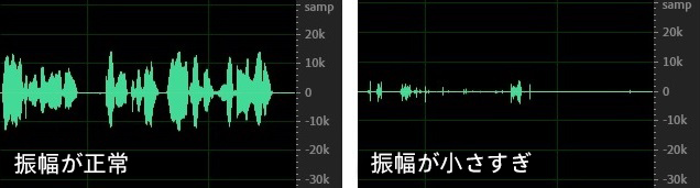 音声の振幅は音量の大きさを決定します。振幅が大きすぎるまたは小さすぎると、音声認識の効果が低下します。推奨振幅は±10k前後で、この範囲であれば音声認識の最適な効果を得ることができます。以下の図に示すように、左側は正常な振幅(±10k 前後の範囲)であり、右側は振幅が小さすぎる(±1k 前後の範囲)ため、右側の音声の認識効果は低下します。